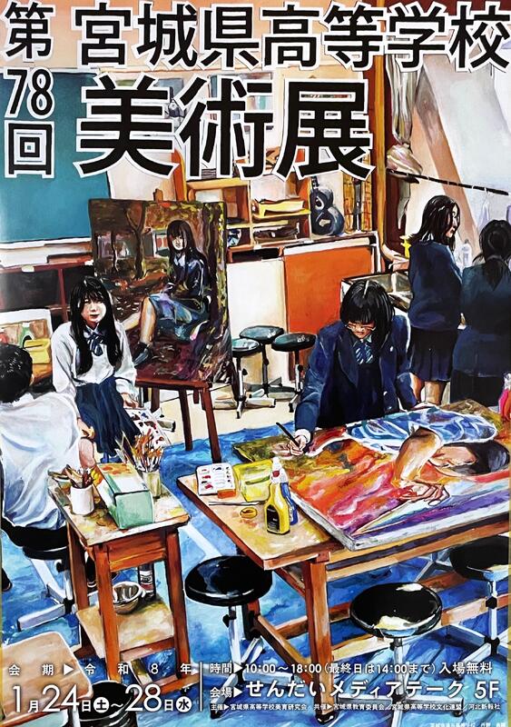 令和8年1月24日(土)から28日(水)まで仙台市・せんだいメディアテークで開催する「第78回 宮城県高等学校美術展」に先駆けて、この展覧会を告知するポスター部門に涌谷高校・美術部の丹野勇輝くんが出品し、最高賞である「最優秀ポスター賞」に選ばれました!