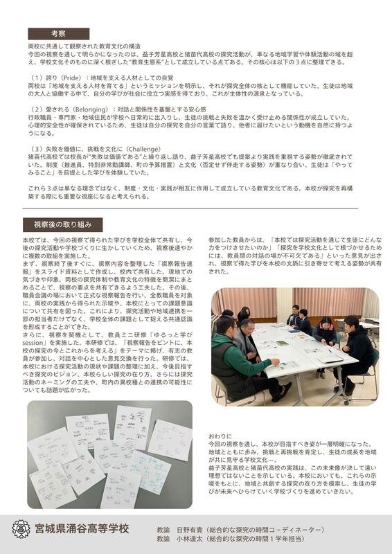 本校においても、今回の視察で得た知見を生かし、地域とともに学びをつくる探究活動の充実を図ってまいります。