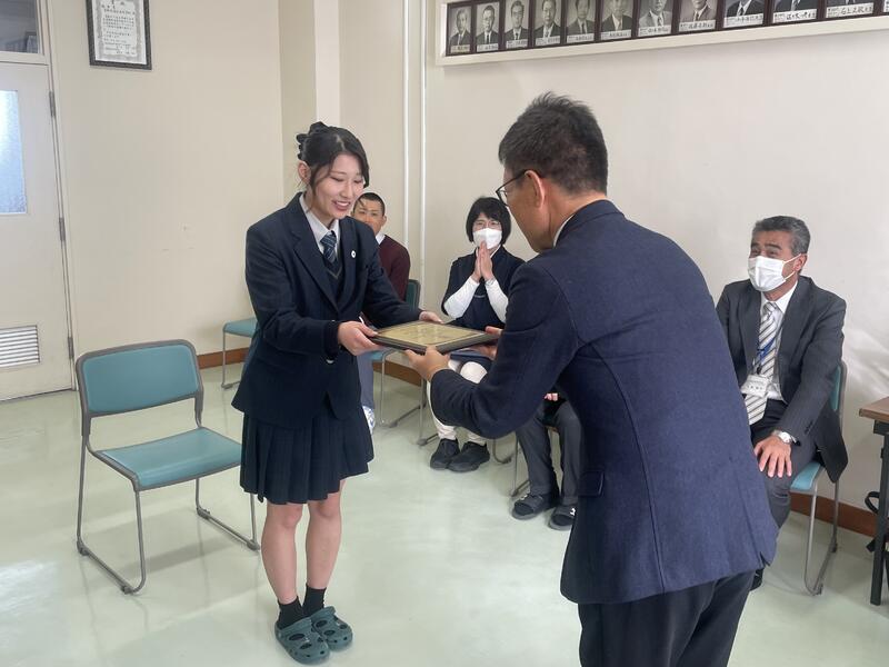 「第15回トンボ1129(いいふく)デザインコンクール」の体育着デザイン部門に3年・菅原華愛さんがデザインした「華やか着物風ジャージ」が最高賞である最優秀賞を受賞しました!12月1日には宮城トンボ(株)様が来校し、賞状・盾とともに、最優秀賞のみがいただける自身がデザインした実物ジャージを授与しました。校内にはその実物のジャージと、制作工程でのアイデアスケッチ等もパネル展示していますので、ぜひご鑑賞ください。