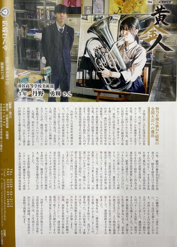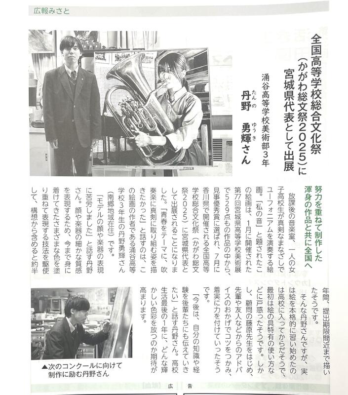 今年の夏に香川県で開催された「かがわ総文2025(第49回全国高等学校総合文化祭)」の宮城県代表として出品した涌谷高校・美術部3年の丹野勇輝くんの「私の音」がこの秋、宮城県2か所で巡回展示されます。